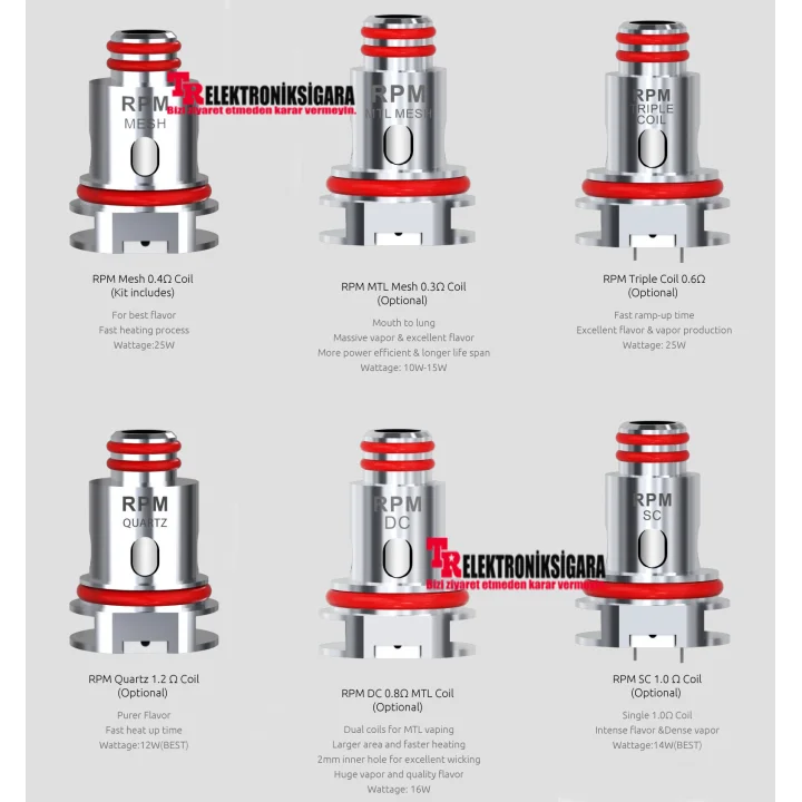 RPM serileri, Smok RPM40 Vape Kit ile uyumludur ve tercihinize bağlı olarak dört farklı dirençle gelir.
